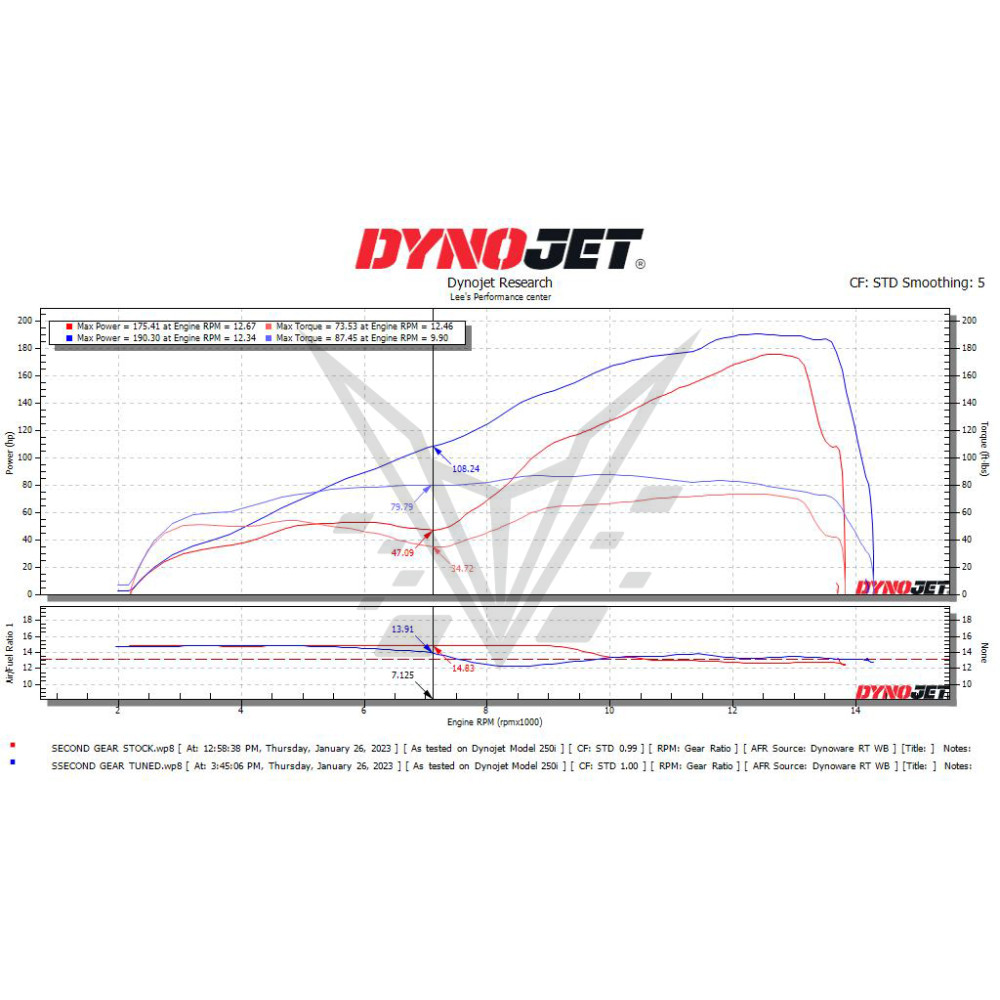 RED = TUNED second gear with 91 Pump Gas - 193whp / 83wtq