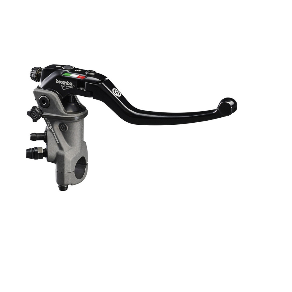 The master cylinder body is made of forge aluminum alloy, machined with 5-axis CAM technology. A hard oxide coating is used for the surface finish, which guarantees that the master cylinder main body is highly resistant to wear and its components move easily. The floating piston and the seals derive directly from those used in MotoGP, as do the housings for the bleeding and fueling systems, which are inclined by more than 30? to make bleeding the master cylinder easier. A study was conducted for the design of the 19RCS CORSA CORTA in order to find consistency of style between all the components of the master cylinder, which now has a distinct, dynamic and sporty look in line with the style of the bikes for which it was conceived (model or design filed simultaneously with the filing of the patent on the technological solution). The lever assembly can be replaced without disassembling the RCS system (Ratio Click System) from the master cylinder and this allows the calibrations made in the installation phase to be maintained unaltered.
