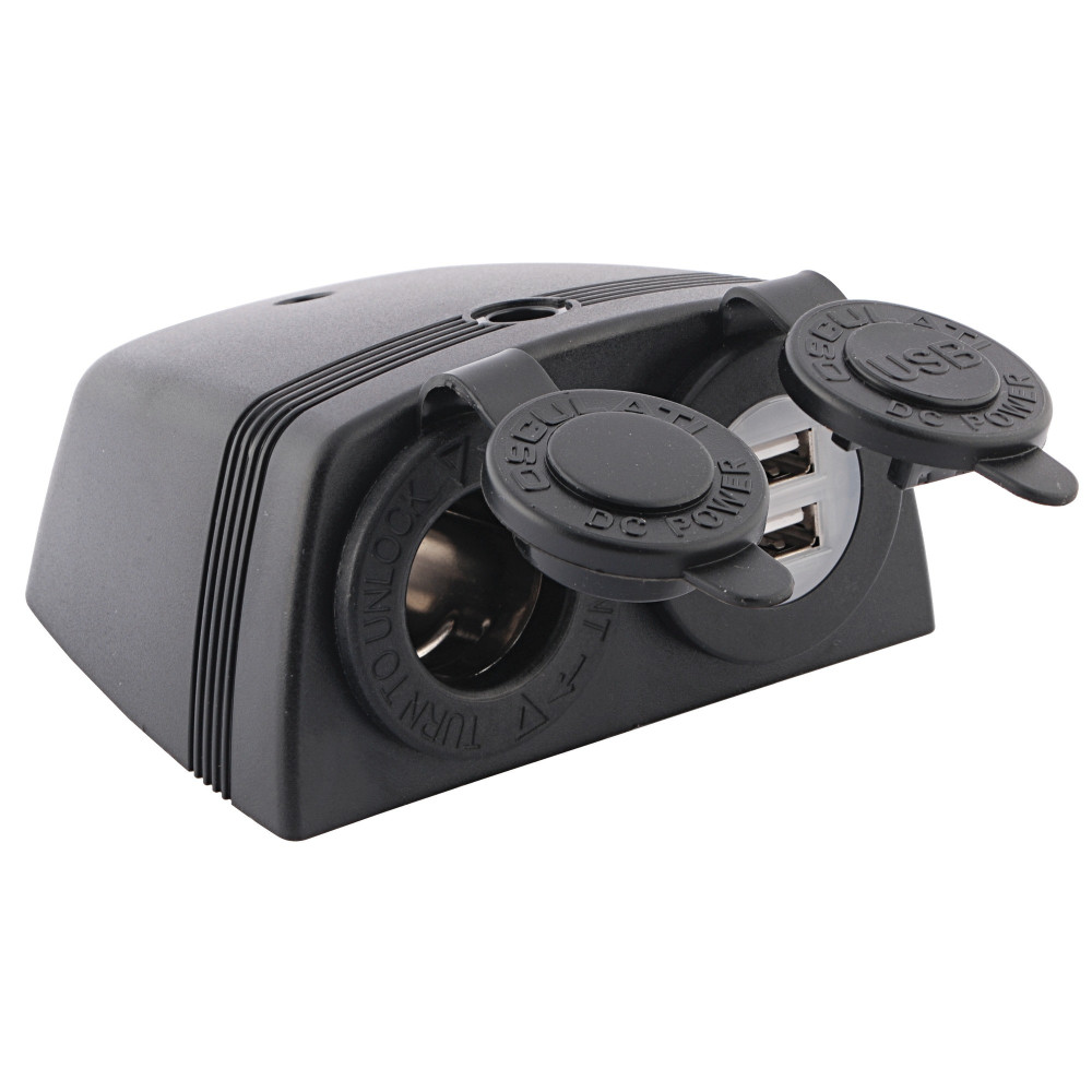 Made of nylon and fit with protection cap to make them waterproof. 12/24V input, 5V USB output.Lighter plug + double USB + body for flat mountingA: 2,1"