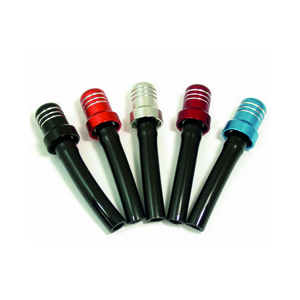 Short vented billet aluminum replacement for the bulky, long stock vent hose. Universal, works on any hose vented gas cap, aluminum or plastic."