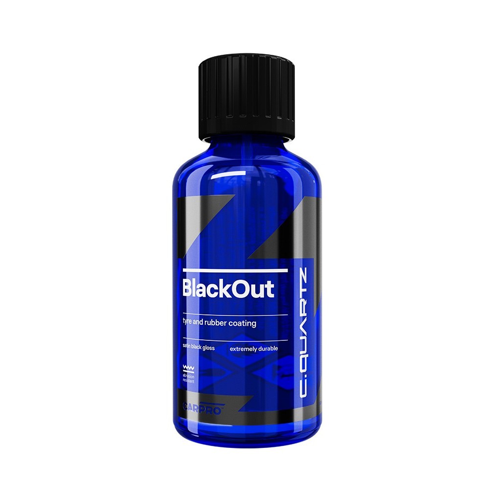 CQUARTZ BlackOut bruker polysiloksanteknologi slått sammen med en løsemiddelbasert akrylharpiks for å skape et utrolig slitesterkt og fantastisk satenglignende utseende for dekk, gummi og umalte harpiksmaterialer.