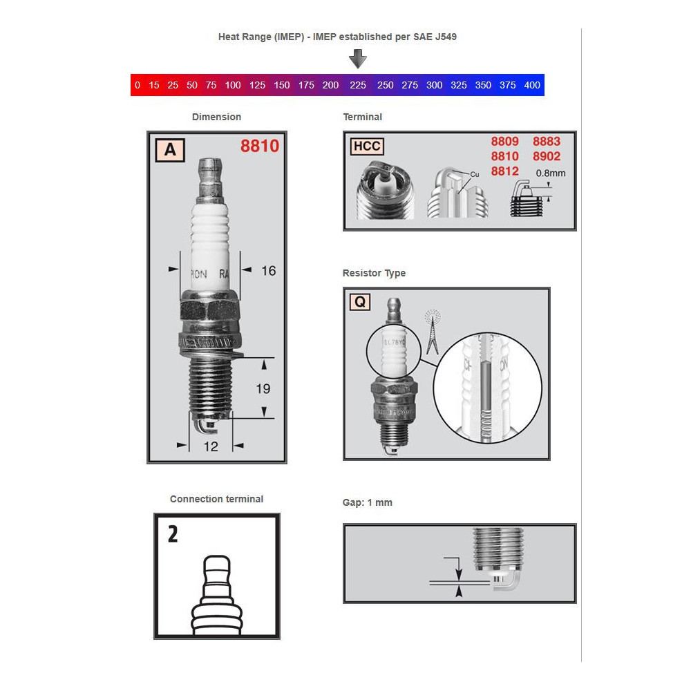 Wrench size:14 mmThread diameter:10,0 mmThread Length:8,6 mmSpark gap:0,4 mmResistance:not interference-free.